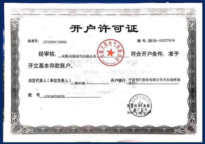 安徽天缆电气银行开户证书
