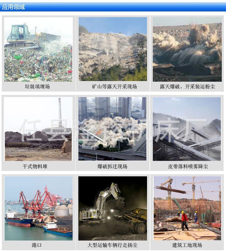 3、 喷出的雾粒细小,与粉尘接触时,形成一种潮湿雾状体,能快速将粉尘仰制。