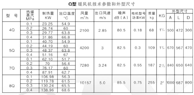 Q型暖风机是由通风机、电动机及散热器组合而成的联合机组。适用于允许空气循球的各种类型的车间,当空气中不含灰尘、易燃、易爆性的气体时,可作为循球空气采暖之用,Q型暖风机是以蒸汽为热媒,供厂矿企业、生产车间及其它大型建筑物中的热风采暖。该型暖风机是经过热工性能试验的,性能稳定可靠的产品。