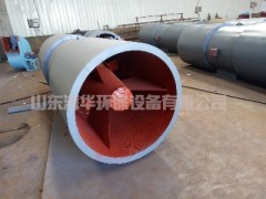 SDF隧道风机由两台或多台工作电机组成,相邻叶轮按相对方向旋转。即两级叶片数互为质数。空气由一级叶轮获得能量经二级叶轮增压后送出。二级叶轮除了增加气流能量外,还兼备普通轴流通风机中的静导叶功能,在获得导向整直圆周方向速度分量的同时,理顺了气流冲击,增加了气流能量,减少了尾迹涡流,降低了噪音。