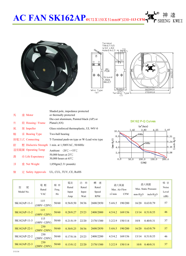 風葉 Impeller:热塑性 UL 84v_0 Glass reinforced thermoplastic, UL 94V-0