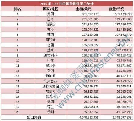 海关数据显示,2016年1-12月,中国出口紧固件274.86万吨,出口金额达45.40亿美元。其中出口金额占前五的市场分别是美国、日本、俄罗斯、香港、韩国。
