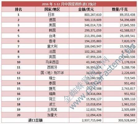 2016年1-12月,中国进口紧固件30.35万吨,进口金额达29.37亿美元。其中进口金额占前五的市场分别是日本、德国、美国、韩国、台湾。