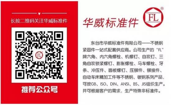 *具行业威望之一的不锈钢紧固件一站式配套供应商东台市华威标准件有限公司为中国机械通用零部件工业协会会员单位,系专业生产制造不锈钢标准件的企业。1999年在东台市首家通过ISO9001国际质量体系认证,2005年12月通过ISO14001环保认证,;FL牌不锈钢标准件荣获;江苏省乡镇企业名牌产品称号,公司为;盐城市明星企业。2012年;FL牌不锈钢紧固件产品荣获;江苏省著名商标、;盐城市名牌产品东台华威为;中国国际商会盐城商会副会长单位。