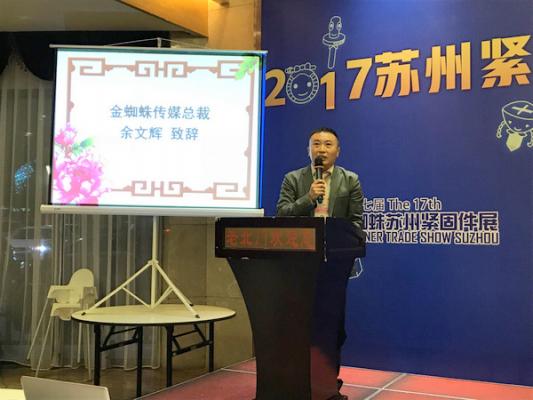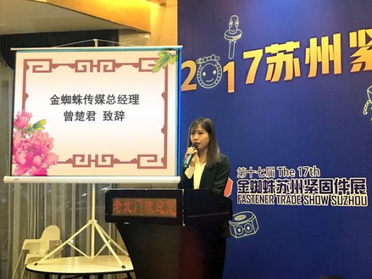 在本次展商联谊晚宴上,金蜘蛛传媒总裁余文辉先生、总经理曾楚君女士分别上台致辞,对嘉宾的到来表示*热烈的欢迎和*诚挚的问候,衷心感谢各位参展商对展会的倾力支持,推动了本届苏州紧固件展的成功举行,希望大家在展会上有所收获,大展宏图!