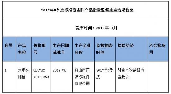据舟山市市场监督管理局官网11月6日消息,三季度,根据《中华人民共和国产品质量法》及《浙江省产品质量监督条例》的规定,舟山市市场监督管理局组织开展了全市标准紧固件产品质量监督抽查,共抽查了1家企业的1批次标准紧固件产品,合格1批次,不合格0批次,批次不合格率为0。
