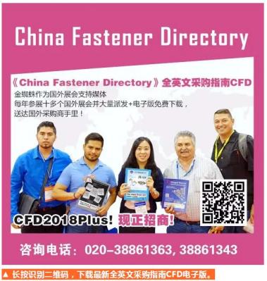 金蜘蛛明星出品专门在海外市场派发的全英文采购指南《China Fastener Directory》,每期发行3万册,参展超过12个国外展会,送达国外采购商手里,并在金蜘蛛英文网 China Fastener Info 上无限量免费下载电子版,在国内外赢得高度赞誉,为中国紧固件企业创造更多产品出口和对外合作的机会。