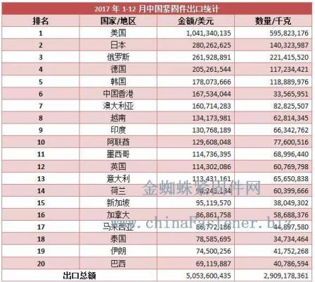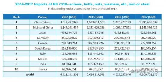 金蜘蛛编辑整理数据发现,根据美国商务部统计数据显示,2017年美国从中国大陆进口紧固件总值为1,141,576,422美元,较2016年同比增长约13.8%,位于美国紧固件第二大进口来源地,占美国紧固件总进口值的23.3%。
