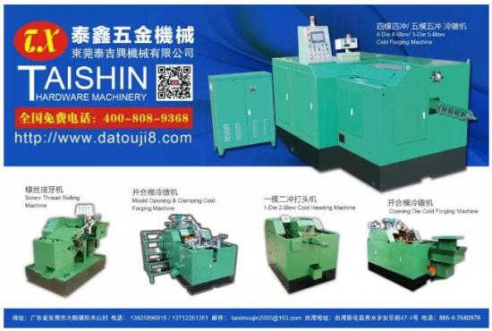 东莞泰鑫五金制品厂 成立于2005年,位于东莞市石排镇水贝工业区,厂房面积5000平方米。本厂拥有专业的机械设计开发团队,并配置高精密度的加工设备用于机械生产。本厂专业制造打头机、搓牙机、多工位冷镦机、开合模冷镦机等螺丝机器,同时生产用于汽车、通讯、家具、电器、卫浴、运动器材、航空、医疗等的各种标准件螺丝和非标准件螺丝。
