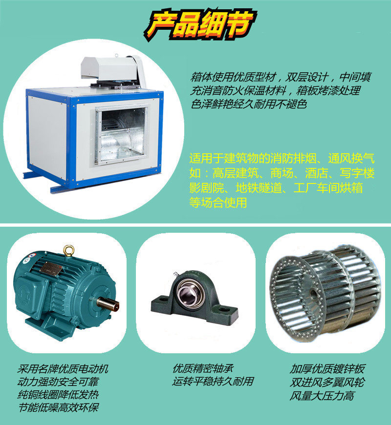 适用于宾馆、写字楼、影剧院、商场、地下室等消防排烟、通风换气之用,也可以作高层建筑及民用建筑的中央空调机组风机段主机用。除此之外还可以作为一般工厂通风排气之用。