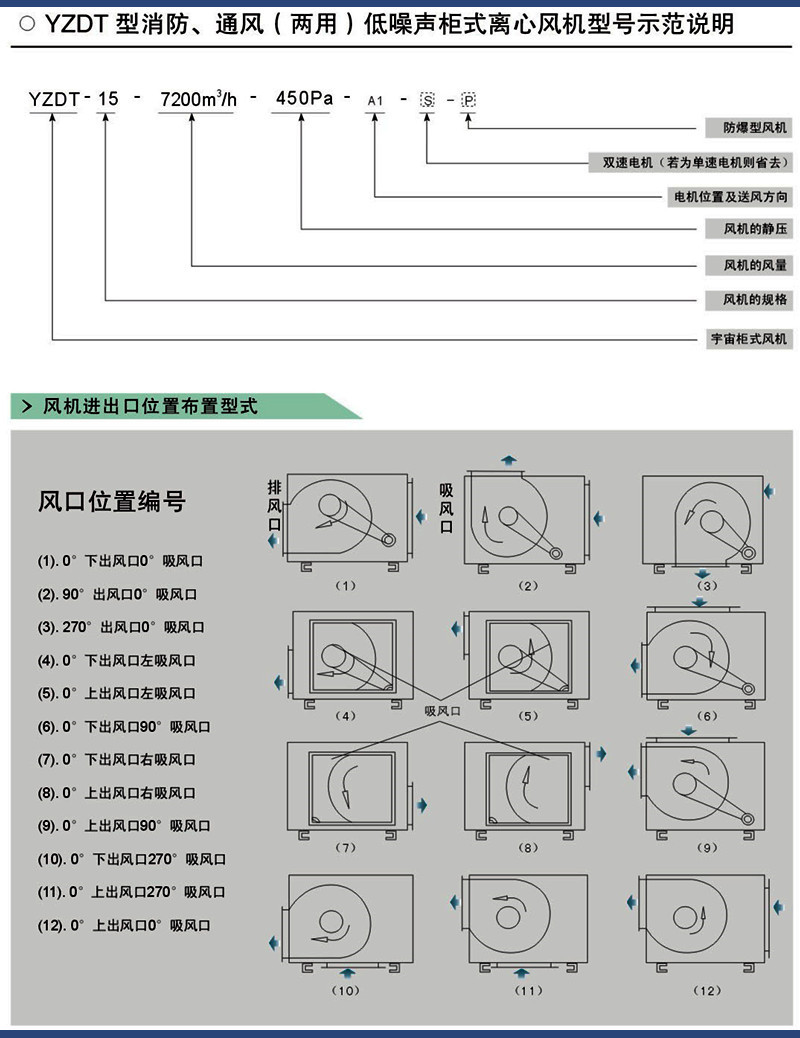 5、吸、出风口标准设计有十二种方向型式可供选择(详见风口位置编号),客户可根据不同的使用场合选取不同的吸、出风型式的风机。亦可按用户要求非标设计生产。