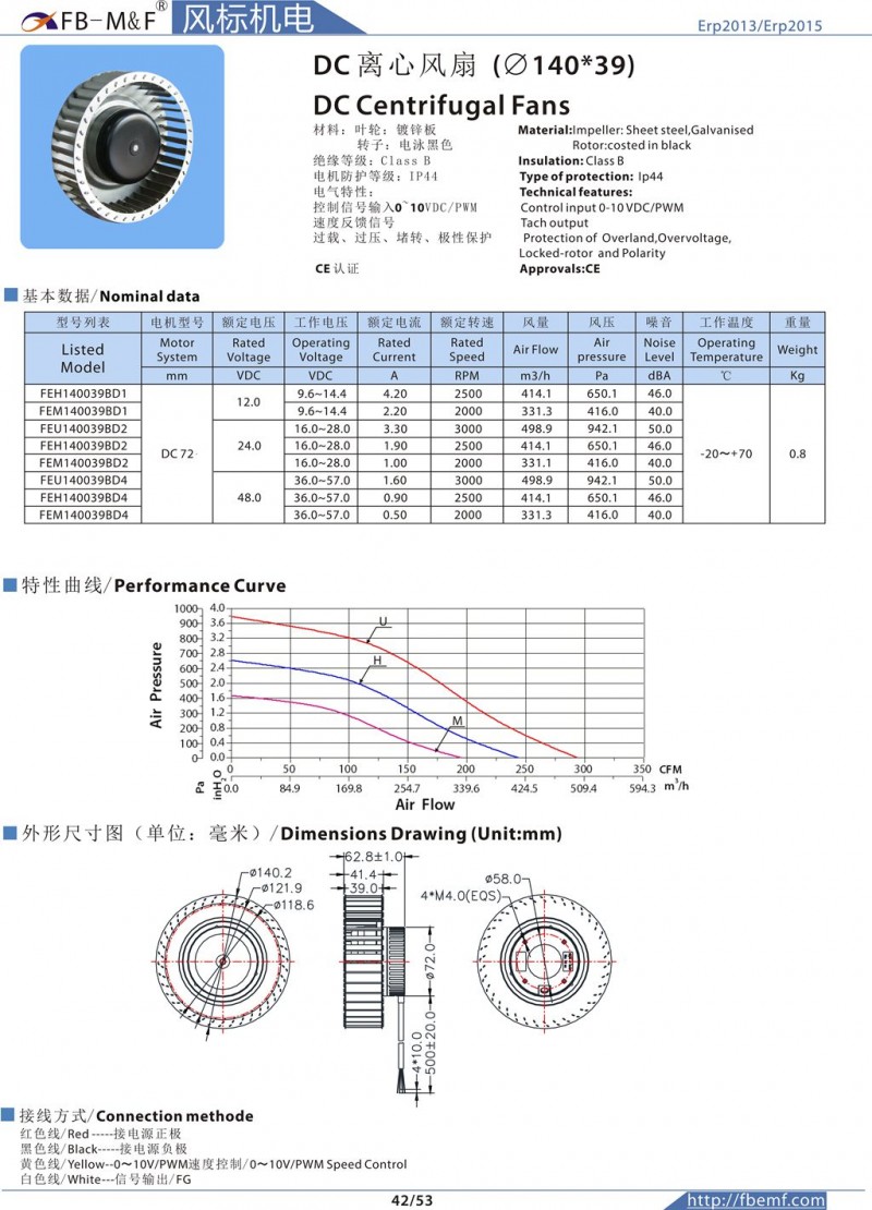 FB-M&F品牌DC离心通风机FE140*39DC72,产品全系列供货,可提供样品及批量定制服务,电极防护等级:IP44IP55IP68可定制!具有德国EBM风机进口品质!