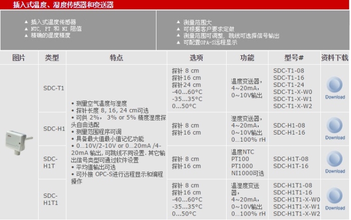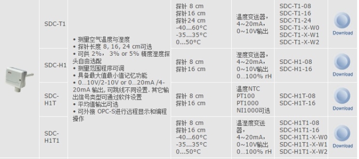 SDC-H1T1该型号为温湿度风管型传感器,管道式安装。其具有测量精度高、测量范围广、质量稳定、信号稳定、功能丰富等特点,适用于中央空调的各种环节的温湿度信号采集。