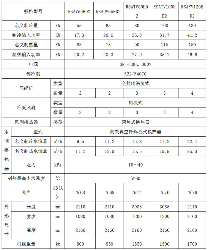 D2系列超低温模块热泵机组参数表: