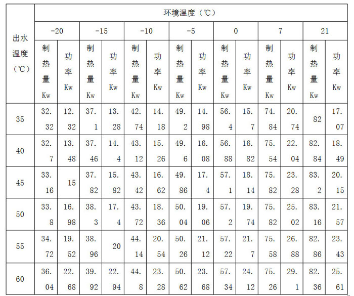 2、制热标定工况:环境温度7℃DB/6℃WB;热水进水温度40℃,出水温度45℃。