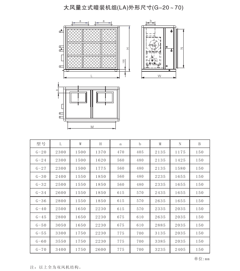 此型机组适用于布置在机房内。尽管机组处理的风量大,但由于结构设计紧凑,机组的高度及占地面积都得到了有效的控制,机内出风口处专门设有消声箱,有效的降低了机组运行时的噪声。