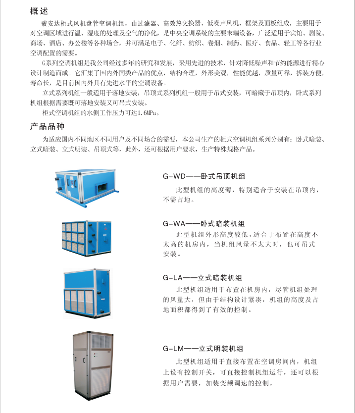 为适应国内不同地区不同用户及不同场合的需要,本公司生产的柜式空调机组系列分别有:卧式暗装、立式暗装、立式明装、吊顶式等,此外,还可根据用户要求,生产特殊规格产品。