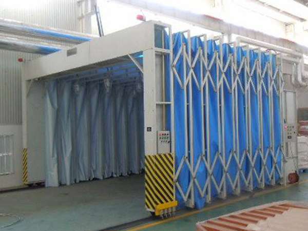 伸缩移动式喷漆房和无泵水幕喷漆房结合使用,是解决重型工件喷漆时移动难的问题,而活动喷漆前室就克服这个问题。工作时将活动前室收缩,用天车将重型工件吊运到喷漆场地,再将活动前室展开,罩住工件,即可工作。喷漆后再将前室收缩,用天车将工件吊离,不影响天车的工作,大大简化了不断用车间天车吊运大型笨重工件来回周转的工艺流程