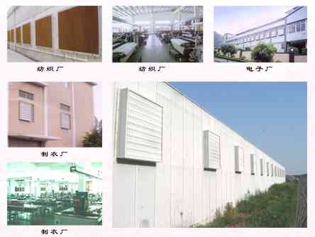 适用范围: 1、几乎所有需要降温或通风换气的场所均可使用,如商场、超市、办公室、宾馆、医院、车站、体育馆、展览馆、歌舞厅、礼堂、会议室、学校、养殖场、网吧、工厂车间等场所。 2、适用于高温或有异味的工业车间,如化工厂,纺织厂,电子厂,机械厂,塑胶厂,制衣厂,电镀厂等各种工业厂房。
