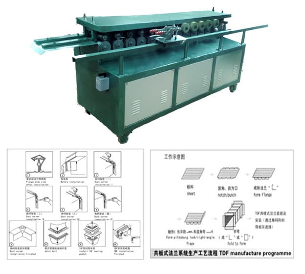 共板法兰机采用两边进料同时成形的工作方式,一边成形“ ”,一边成形安装勾夹“ ”形。采用共板式自成法兰,使矩形风管法兰的快速制作成为可能,具有制作成本低、安装效率高等特点,便于批量标准化生产,多用于矩形风管管道截面要求不大的场合使用。