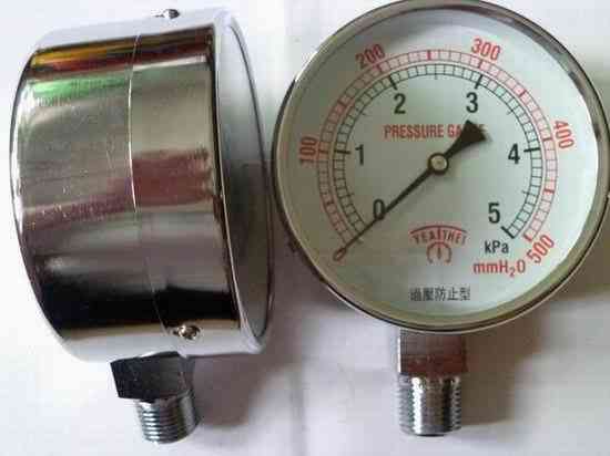 直径: 60MM 75MM 100MM 150MM(可定做全不锈钢) 精度: 2.5% 1.5% 单位: kpa mbar mmh2o mmaq psi 量程: -100~0``````100kpa 表壳: 铁质镀铬或电泳黑色 表框: 镀铬,平面玻璃镜面 膜盒材质:铜合金 连接螺纹:M14 1/4 1/8 3/8 1/2 PT NTP或非标定做 应用范围: 用于测量管道终端用气压力显示,广泛应用于瓦斯燃烧设备及工业加热系统,如调压站,调压箱,燃烧机,风机,
