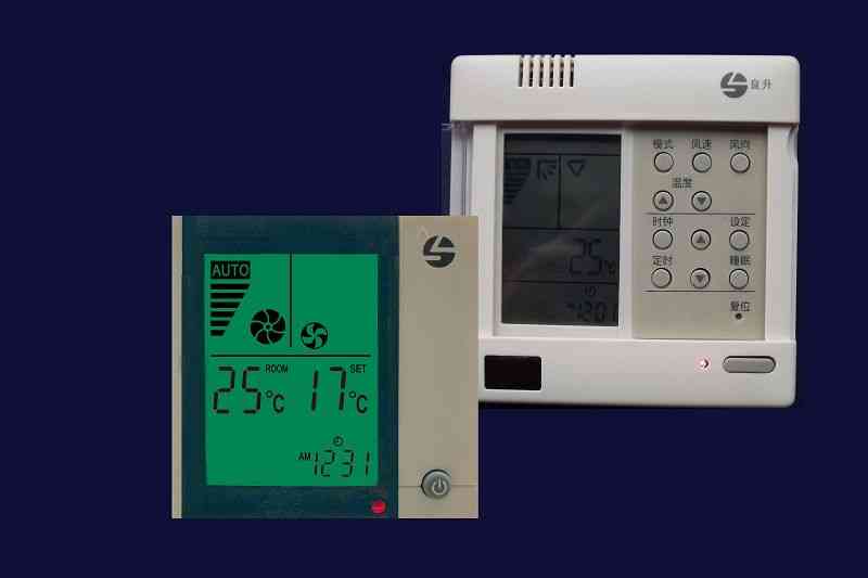 多功能大液晶温控器; 型号:LS-X1 面板尺寸为 12cm×12cm×2cm ,配6米信号线连接至回风口上控制盒,屏幕有透明 防护翻盖,外观大气。有摆风按键。 详见使用说明