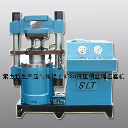 索力特生产YS系列钢丝绳压套机:由端座、座板活塞、活塞杆、端帽、动力、定刀座、油缸、外壳、泵体、揿手、0型密封圈、拉臂等另件组成,利用液压传动原理,上下撤动揿手,撤动油泵活塞驱动力向外伸出进行切割。广泛用于船舶修造,工矿、吊装等部门。