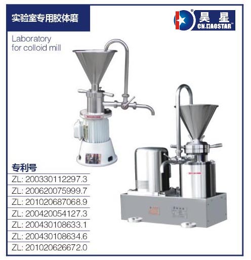 CN.HAOSTAR昊星*新科技研制而成实验型胶体磨(湿法粉碎机,精品胶体磨,改良胶体磨,全封闭式胶体磨,管线式研磨机,白炭黑打浆泵,耐磨耐腐研磨泵,转子泵,胶磨机,高速胶体磨,碾磨机,乳化胶体磨,细微湿法粉碎机,湿料粉碎机,超微湿法粉碎机,超微豆浆机) 多功能研磨机等等拥有国家专利40多项专利发明,外形新颖,整体卫生,环保节能。实验型胶体磨的高速剪切、分散、搅拌、解聚、混合、均质、乳化、研磨粉碎八合一实验设备配置如下: