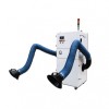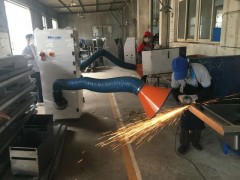 焊烟除尘器通过风机引力作用,焊烟废气经万向吸尘罩吸入设备进风口,设备进风口处设有阻火器,火花经阻火器被阻留,烟尘气体进入沉降室,利用重力与上行气流,首先将粗粒尘直接降至灰斗,微粒烟尘被滤芯捕集在外表面,洁净气体经滤芯过滤净化后,由滤芯中心流入洁净室,洁净空气又经活性碳过滤器吸附进一步净化后经出风口达标排出。