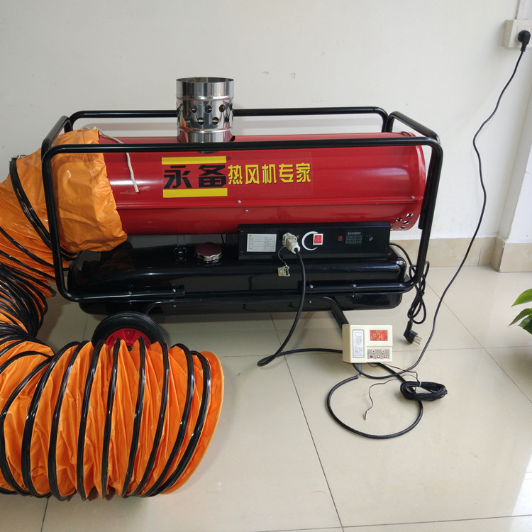 1、间燃型热风机,有排烟道,使用柴油或者煤油,不锈钢高效热交换器,分离燃烧尾气,保证送风的洁净;