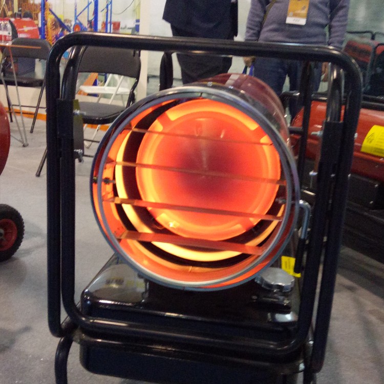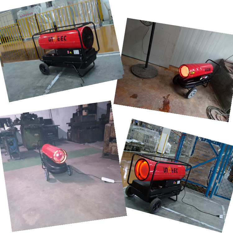 很多工厂车间由于厂房空间建的比较高大,这么大面积的空间用普通的采暖方式基本是效果微呼其微的,并且还会造成大量的基础设施建筑成本及后期运转费用的浪费。这时候你需要在您的车间里安装一台工业暖风机,它不仅能取暖而且还能防潮干燥,关键是移动方便,加热面积大,柴油暖风机就是专门为大型厂房车间而生的。大型厂房车间采暖选择工业燃油热风机是你明智的选择。柴油暖风机是使用柴油为燃料的一款冬季加热采暖烘干设备,没有排烟囱,属于直燃式热风机。用于各种场所的临时加热或整体加温。工作时,油箱中的燃料被吸入到喷油嘴,在燃烧室雾化后被点燃并燃烧。燃烧产生的热量加热空气及整个加热区域,燃油暖风机的风扇送入的空气一部分进入燃烧室提供氧气助燃,产生热量。少量高温烟气与大量热气在出风口混合后被排出;出风温度可以达到 300 摄氏度,基本上99%的燃烧热量被排放到加热空间,因此加热速度非常快,从而达到了高温采暖的目的。
